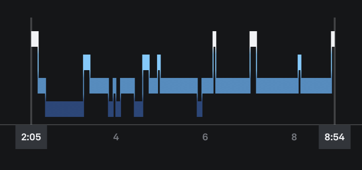 Actigrafía: 6:50h de sueño efectivo. Predominio de sueño profundo al inicio de la noche, predominio de sueño superficial en la segunda parte de la noche. Escaso sueño REM. Representa un sueño ligero, poco reparador. Blanco: vigilia, despertares; azul claro: sueño REM; azul oscuro: fas superficial noREM; azul muy oscuro: fase profunda noREM
